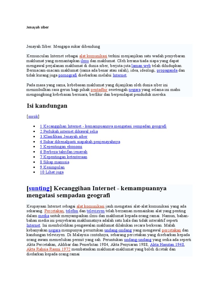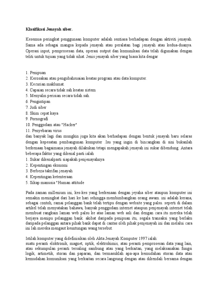 10 bentuk jenayah siber. Jenis jenayah siber yang biasa kita dengar termasuklah penipuan kerosakan atau pengubahsuaian ke atas program atau komputer kecurian maklumat capaian secara tidak sah ke atas sistem pengintipan penyebaran virus dan banyak lagi. Bagaimanapun perbuatan ini sukar dibendung kerana kesukaran mengenal pasti penjenayahnya. Faktor dalam kadar jenayah siber yang lebih tinggi di negara negara yang mempunyai lebih banyak akses kepada sambungan jalur lebar. Penggodam atau hacker 11.
