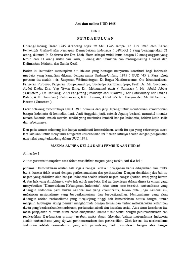 Undang undang dasar suatu negara ialah hanya sebagian dari hukumnya dasar negara itu. Negara republik indonesia tahun 1945 dalam satu naskah undang undang dasar negara republik indonesia tahun 1945 pembukaan p r e a m b u l e bahwa sesungguhnya kemerdekaan itu ialah hak segala bangsa dan oleh sebab itu maka penjajahan di atas dunia harus dihapuskan karena tidak sesuai. Uud 1945 berperan penting dalam memberikan hak hak seluruh warga negara dari berbagai lapisan masyarakat. Konstitusi suatu negara cuma bagian dari hukum dasar negara itu yang muncul dan dipertahankan dalam praktik negara meskipun tidak tertulis adalah aturan dasar yang muncul dan dijaga dalam praktik administrasi negara meskipun tidak tertulis.