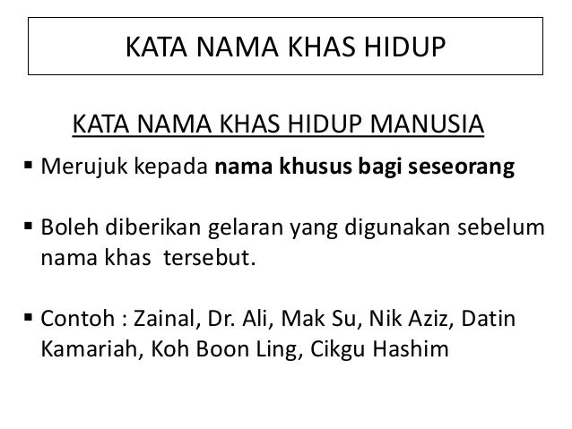 Kata nama khas dibahagikan kepada dua kumpulan iaitu kata nama khas hidup dan. Kata nama khas jenis ini terdiri daripada perkataan yang merujuk benda benda yang khusus tetapi bukan hidup misalnya nama benda institusi negara tempat bangsa bahasa pangkat undang undang dan seumpamanya. Bina ayat contoh ayat untuk perkataan. Beliau diberi gelaran malaikat maut sebab hanya dengan lambaian tangannya ke kiri atau ke kanan boleh menentukan hidup matinya tahanan perang di kem tersebut.