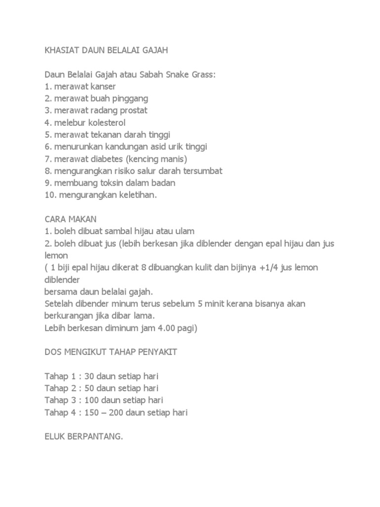 Masukkan 30 50 helai daun sebiji epal hijau gelas air dan blend sampai halus minum terus ulang sekali lagi di sebelah petang diminum sebelum atau selepas makan. Kunyah 30 50 helai daun belalai gajah sehari iaitu 10 atau lebih helai daun sekali makan untuk 3 atau lebih kali sehari. Khasiat daun belalai gajah untuk mengobati kencing manis memang sudah familiar oleh masyarakat terutama masyarakat indonesia malaysia dan thailand. Daun belalai gajah atau sabah snake grass telah lama dikenal pasti mempunyai antioksidan yang tinggi untuk mengatasi sel sel kanser dan mengekalkan sel sel sihat dalam tubuh manusia.