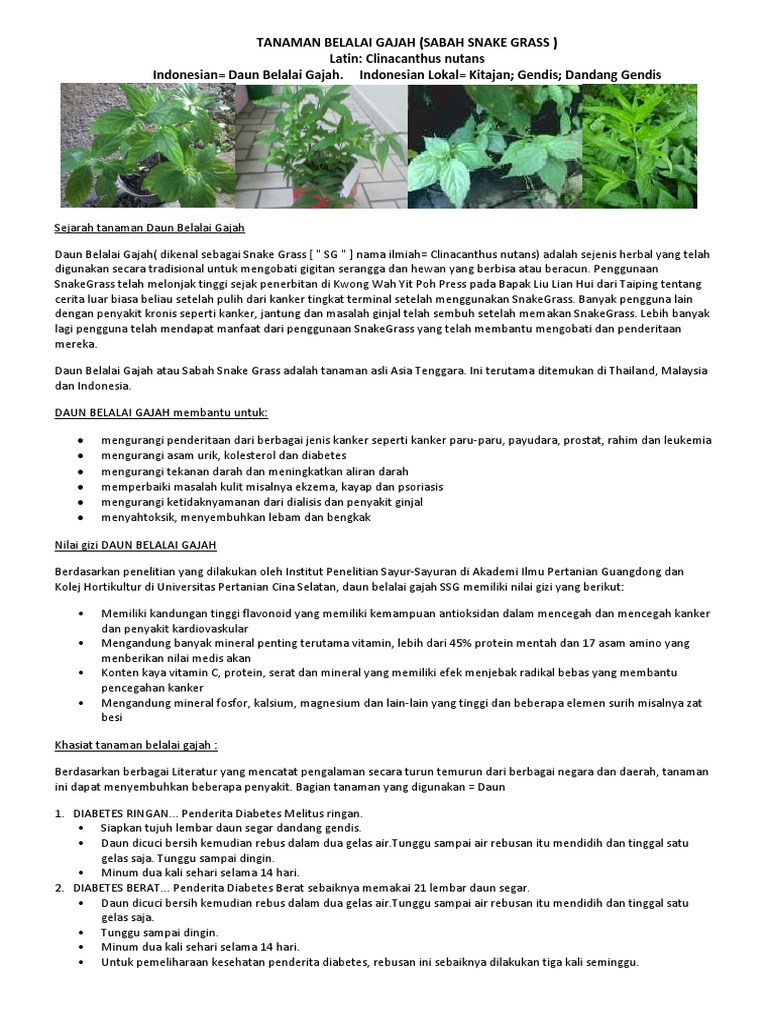Masukkan 30 50 helai daun sebiji epal hijau gelas air dan blend sampai halus minum terus ulang sekali lagi di sebelah petang diminum sebelum atau selepas makan. Orang yang masih menjalankan terapi juga boleh makan daun belalai gajah ini. Selepas pengambilan jus daun belalai gajah ketumbuhan surut 3 4cm. Daun belalai gajah ni juga dikenali sebagai sabah snake grass dalam bahasa omputihnya.