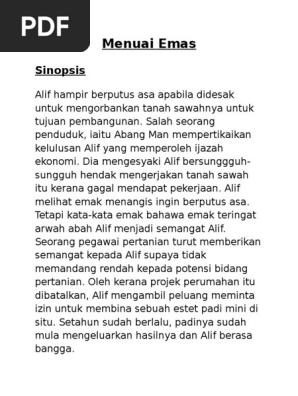 Cerpen komsas tingkatan 2menuai emassenang je sinopsis kata kata semangat abah masih terngiang ngiang manakala sokongan kental mak wan dalam mempertahankan tanah bendang mereka sambil memujuk pemilik petak bendang yang lain akhirnya membuka jalan kepada alif untuk menggembleng muafakat penanaman padi secara estet. Cerpen menuai emas. Menuai emas salina ibrahim sinopsis. Alif berbisik bahawa tidak lama lagi dia akan menuai emas.