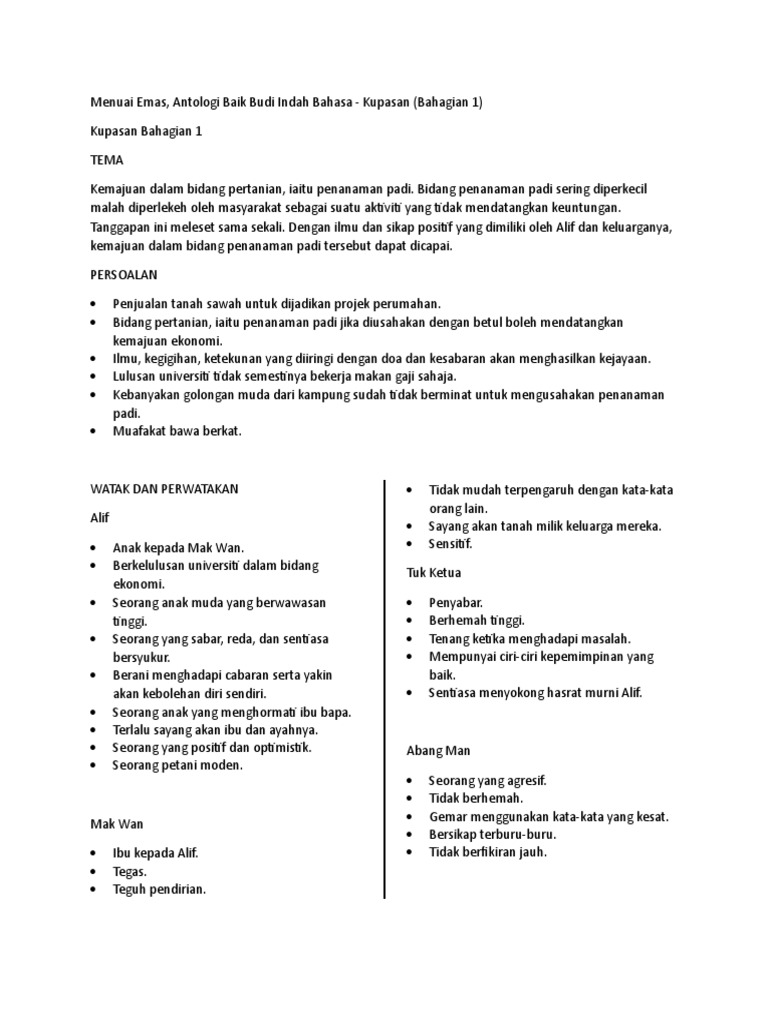 2016 menyaksikan penukaran teks antologi komsas tingkatan 2 antologi ini akan digunakan mulai 2016 hingga 2020. 8 00 pg antologi tingkatan 2 cerpen 1 comment kupasan cerpen. Cerpen menuai emas k. Plot binaan plot teknik plot plot binaan plot a permulaan alif terkenang akan perbualan dia dengan ayahnya suatu ketika dahulu.