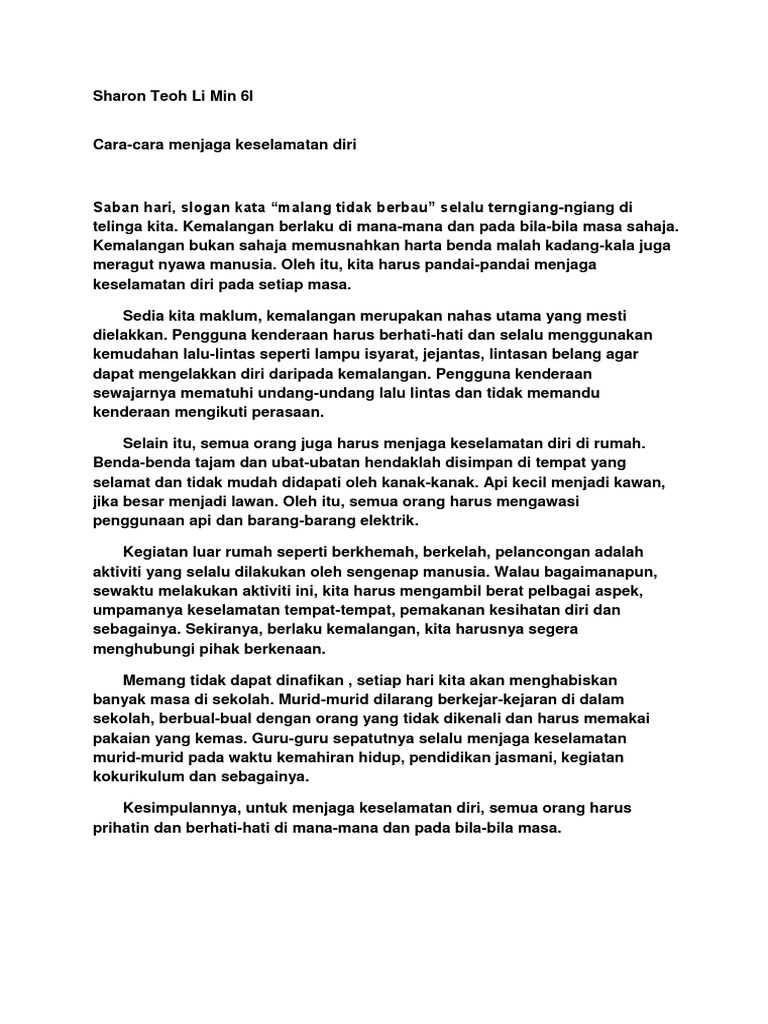 Kepentingan cara cara menjaga keselamatan diri di sekolah rangka karangan pendahuluan menjaga keselamatan diri di sekolah penting untuk mengelakkan kemalangan malang tidak berbau isi 1 di dalam bilik darjah elakkan berlari bertolak tolakan bergaduh tidak bermain barangan yang boleh membahayakan diri seperti barangan elaktrik.