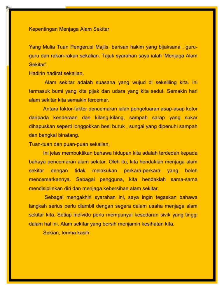 Contoh karangan syarahan kepentingan menjaga alam sekitar. Tajuk syarahan saya pada pagi ini ialah kepentingan menjaga alam sekitar. Contoh karangan kepentingan menjaga alam sekitar pendahuluan mutakhir ini kita sering kali dikejutkan dengan kejadian bencana alam yang melanda hampir kebanyakan negara serta telah meragut ribuan nyawa yang tidak berdosa. Alam sekitar yang bersih akan menjadikan kehidupan kita lebih baik. Hujan pertama saya langkah langkah yang boleh diambil adalah melalui pendedahan media massa.