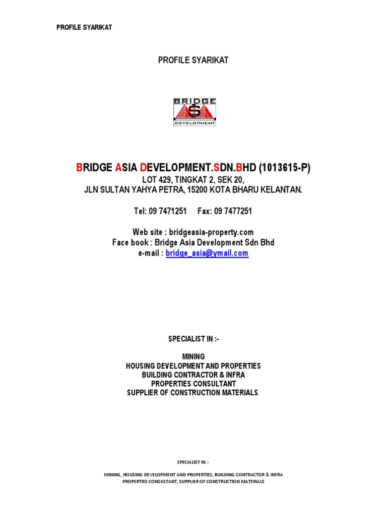 Profile syarikat specialist in mining housing development and properties building contractor infra properties consultant supplier of construction materials profile syarikat bridge asia development sdn bhd 1013615 p lot 429 tingkat 2 sek 20 jln sultan yahya petra 15200 kota bharu kelantan. Syarikat pemasaran digital pdf. Rm 30 400 00 cadangan pembinaan 84unit kilang dua tingkat jenis kluster. 2 ep supply services pengenalan syarikat ep supply services.