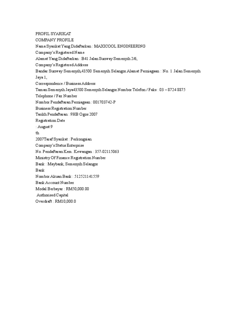 Contoh profil syarikat sdn bhd. Pendaftaran w 700736. Profil syarikat merupakan sebuah dokumen yang mengandungi maklumat maklumat penting bagi sesebuah perniagaan dan. Syarikat felda technoplant sdn bhd ftpsb telah ditubuhkan pada 22 jun 2005. Syarikat kontraktor kerja sivil mekanikal penyelenggaraan kawasan dan perkhidmatan pengurusan bertaraf bumiputera.
