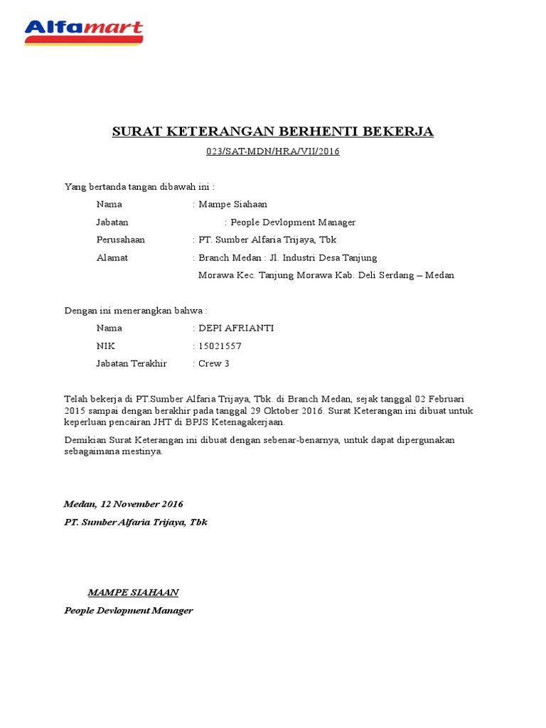 Demikian surat keterangan ini agar dipergunakan sebagaimana mestinya. Contoh format surat pemberhentian kerja. Hal ini dilakukan dengan memberikan pengertian pada perusahaan bahwa proses keluar dari pekerjaan adalah dengan cara yang baik dalam artian tidak dipecat sehingga berhak mendapatkan surat keterangan kerja untuk mengurus bpjstk dan lain. Ada banyak jenis dan contoh surat pemberhentian kerja yang seringkali dipergunakan.