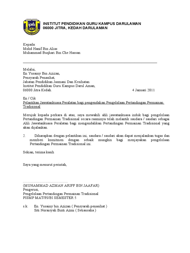 Contoh surat pelantikan jawatankuasa keselamatan dan kesihatan. Fungsi jawatankuasa keselamatan dan kesihatan osha 1994 seksyen 31 1. Untuk mempastikan pelaksanaan dasar ini seorang pegawai keselamatan dan kesihatan dilantik disetiap pejabat untuk menyelaraskan aktiviti aktiviti keselamatan dan kesihatan seperti yang telah dirancang. Untuk ahli ahli yang telah dilantik sekiranya berminat untuk menceburi bidang keselamatan dan kesihatan pekerjaan atau ingin menjadi sho penting untuk simpan surat lantikan ini dengan 3 tahun pengalaman berkaitan dengan kkp anda boleh memohon kompetensi sbg sho dengan syarat lulus exam sho not just a testimonial perlulah laksanakan tugas dan semua dokumen boleh disimpan sebagai bukti. Pengenalan setiap kali kita ingin menulis surat rasmi pasti kita akan berfikir untuk mencari ayat yang sesuai bagi menyampaikan maksud atau tujuan kita dan dalam masa yang sama tidak menyingung perasaan mana mana pihak sebenarnya surat rasmi terbahagi kepada tiga bahagian utama iaitu permulaan pertengahan dan penutup surat.