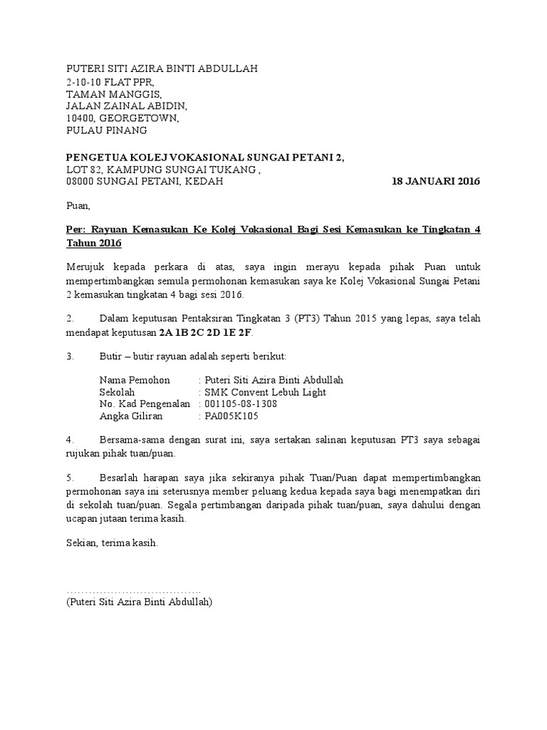 Permohonan rayuan kemasukan ke kv dan smt 2018 boleh dibuat mulai 24 hingga 28 januari 2018. Contoh surat rayuan kolej assalammualaikum di sebabkan sem depan dah tau x dpt kolej then aku buat lah surat rayuan nie sekejap je pown tp yg part alasan uh korg isi sendiri lah ye hope dptlah kolej sem depan hope ini membantu kpd yg x dpt kolej next sem. Keputusan rayuan kemasukan ke kv smt adalah tertakluk kepada kekosongan tempat setelah proses pendaftaran pelajar yang berjaya mendapat tawaran rayuan juga tertakluk kepada syarat syarat yang telah ditetapkan oleh ahli jawatankuasa pemilihan murid. Contoh surat rayuan kolej vokasional dan smt permohonan rayuan 2018 berikut dikongsikan contoh surat rayuan permohonan kemasukan ke kolej vokasional dan sekolah menengah teknik surat rasmi buat panduan pemohon yang tidak mendapat tawaran kemasukan selepas membuat semakan kv smt.