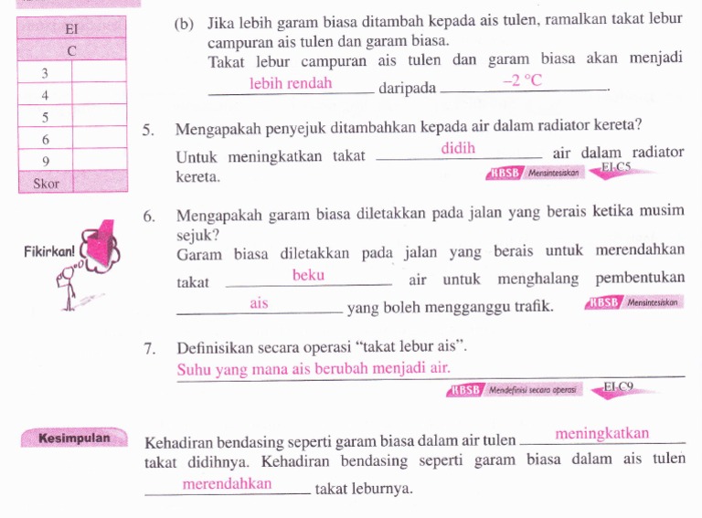 Takat didih air suling dimalarkan. Kesan bendasing terhadap takat didih cecair tulen. Garam dicampurkan ke dalam ais untuk menurunkan takat lebur ais supaya ais tidak melebur dengan cepat. 2 eksperimen 3 geotropisme bag.