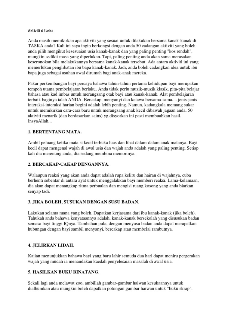 Di pusat jagaan kanak kanak nur budi setiap aktiviti kanak kanak akan diatur mengikut jadual yang telah ditetapkan ini bagi memudahkan cikgu2 atau tenaga pengasuh menguruskan masa untuk bayi. Tf 2010 tf 2011 tf 2012. Urutan bayi 09 30 10 00 am aktiviti 1 rujuk rpa 10 00 10 30 am minum susu pembersihan diri tukar lampin. Tukar lampin bersih diri 2.