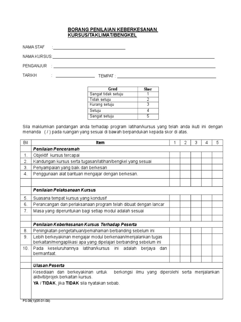 Sangat berkesan berkesan kurang berkesan tidak berkesan langsung 10 9 8 7 6 5 4 3 2 1 2. Penghasilan kerja jika berkaitan dengan kursu s yang dihadiri butiran peserta kursus borang ul 03. Contoh borang penilaian keberkesanan latihan.