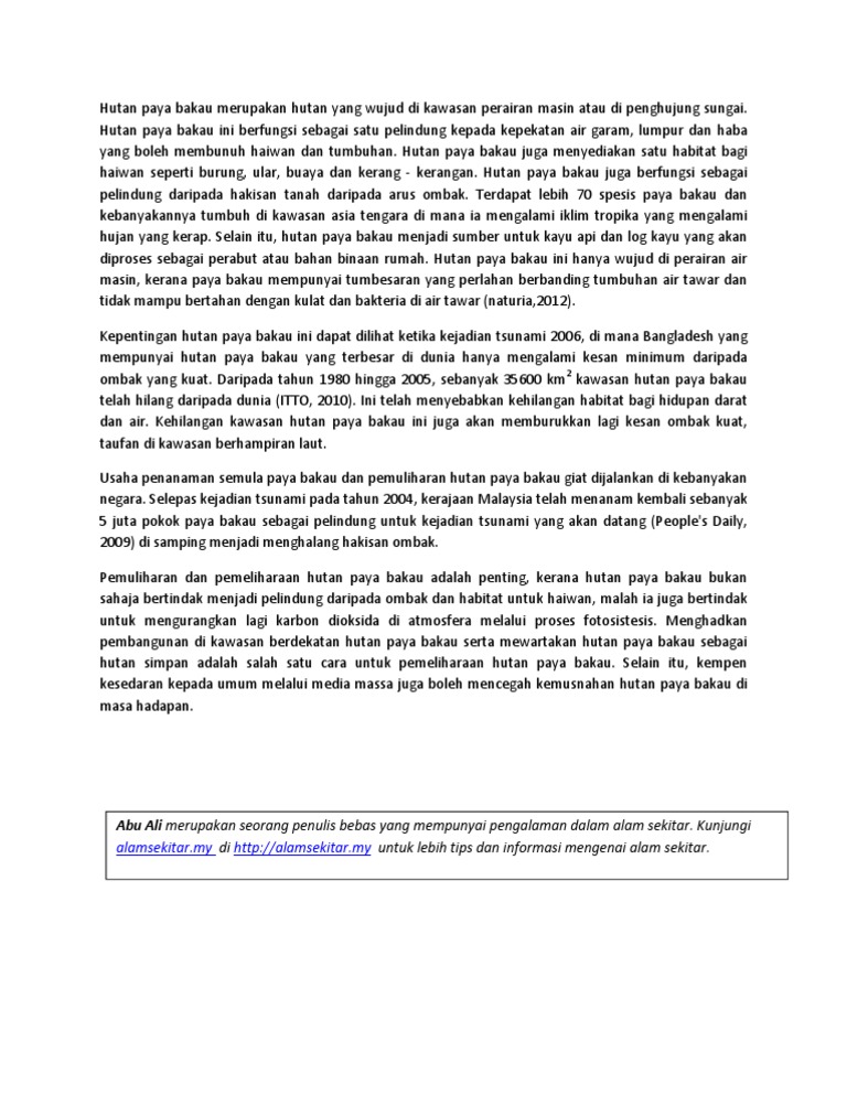 Hutan paya bakau merangkumi 1 3 iaitu 190 000 240 000 km persegi daripada pesisir pantai tropika dan subtropika barbier cox 2004. Kawasan hutan paya bakau. Struktur hutan paya air masin. 2 5 ciri ciri hutan paya bakau paya bakau merujuk kepada kumpulan hutan unik yang mendominasi zon pasang surut pantai tropika dan subtropika umumnya antara latitud 30o utara dan 30o selatan chapman 1977.
