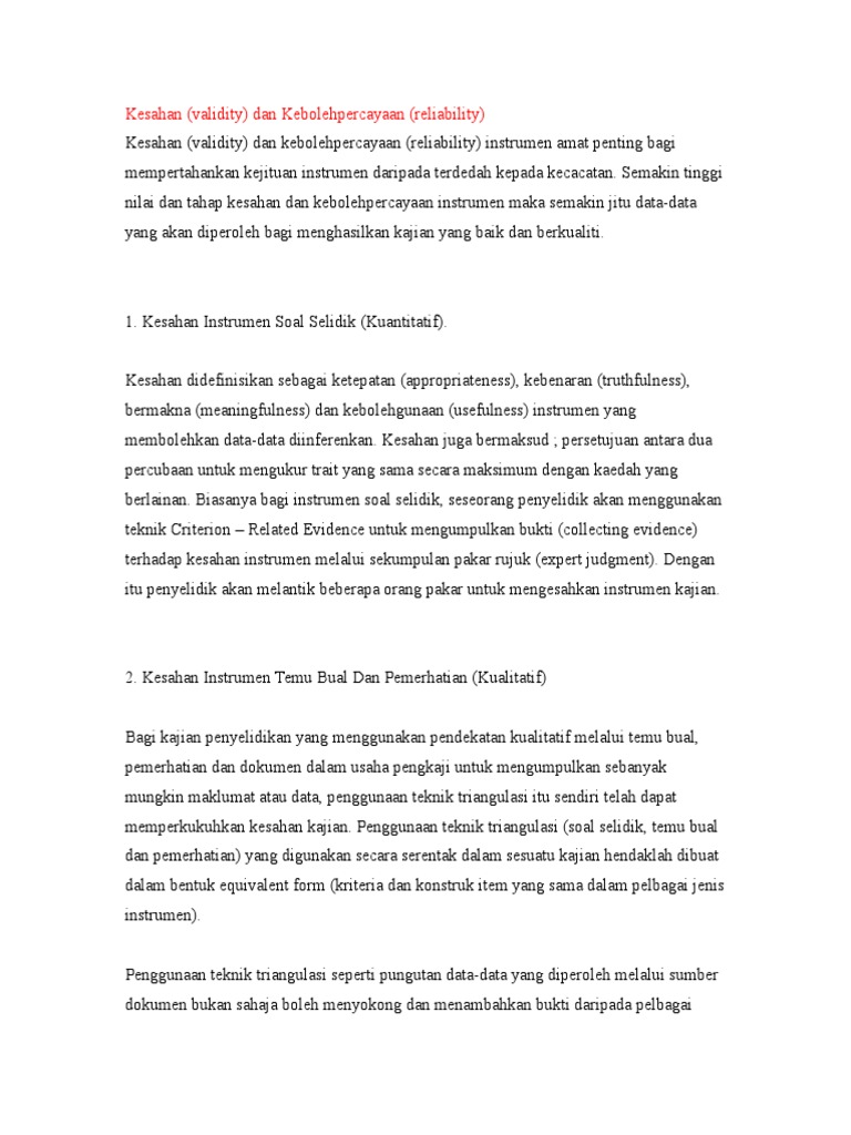 Ia tidak sama dengan kebolehpercayaan yang merujuk kepada sejauh mana pengukuran menghasilkan hasil yang konsisten. Kesahan dalam paradigma kualitatif telah didefinisikan oleh othman lebar 2009 dan chua yan piaw 2006. Semakin tinggi nilai dan tahap kesahan dan kebolehpercayaan instrumen maka semakin jitu data data yang akan diperoleh bagi menghasilkan kajian yang baik dan berkualiti ghazali 2002. Kesahan instrumen soal selidik kuantitatif.