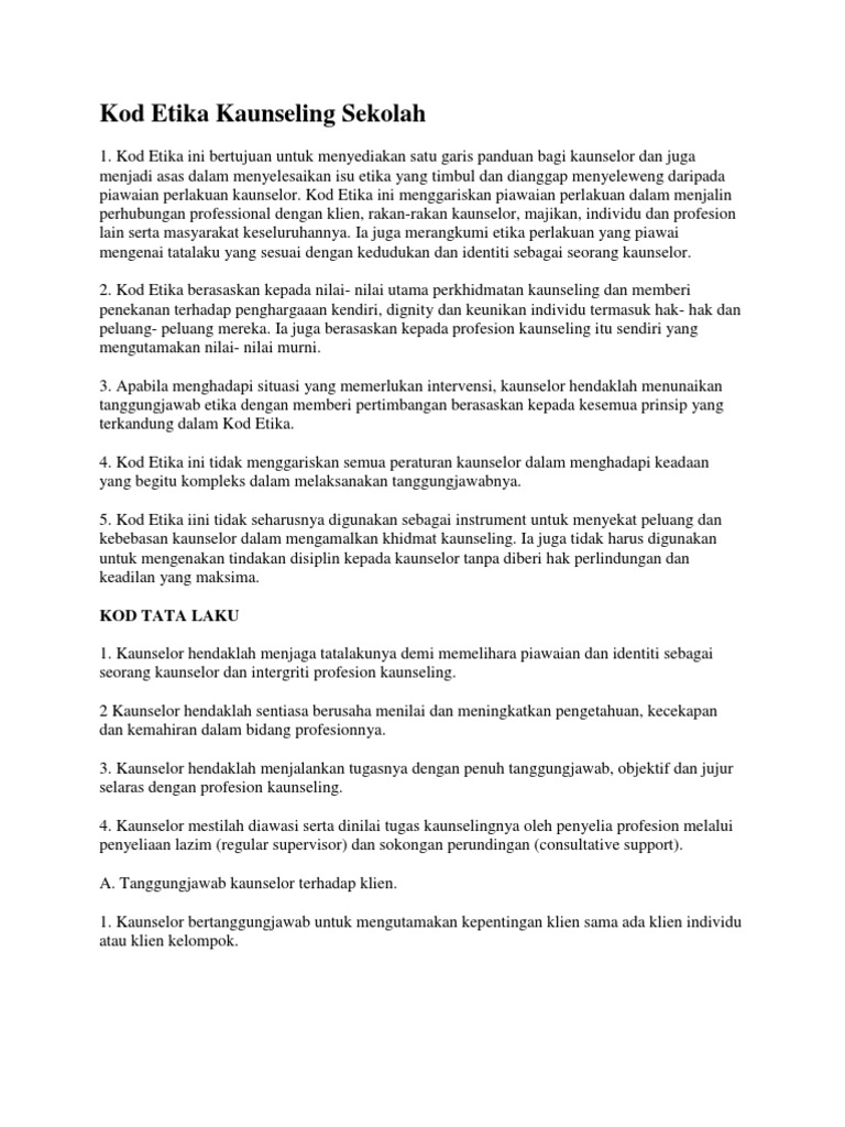 Kod etika kaunselor lembaga kaunselor malaysia. Kod etika profesional juga mengariskan bahawa dalam perkhidmatan kaunseling kaunselor seharusnya menjaga kesejahteraan klien yang datang mendapatkan khidmat kaunseling. Kod etika ini menggariskan standard perlakuan kaunselor dalam menjalin perhubungan profesional dengan klien rakan rakan kaunselor majikan individu dan profesion lain serta masyarakat keseluruhannya. V v sokongansokongan kod etika untuk menyokong tindakannyakod etika untuk menyokong tindakannya dalam memberi sokongan apa yang telahdalam memberi sokongan apa yang telah dilakukan kaunselor yakin akan pekerjaandilakukan kaunselor yakin akan pekerjaan yang di lakukan dan tidak salah disisiyang di lakukan dan tidak salah disisi undang undang agama dan etika organisasi undang undang agama dan.