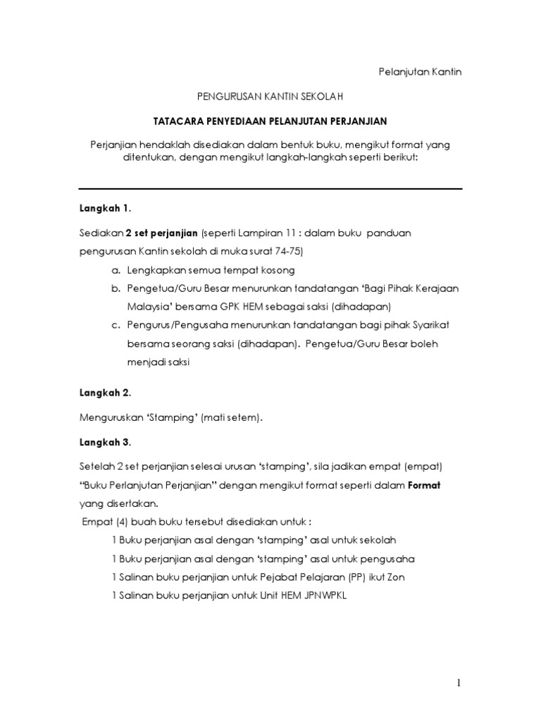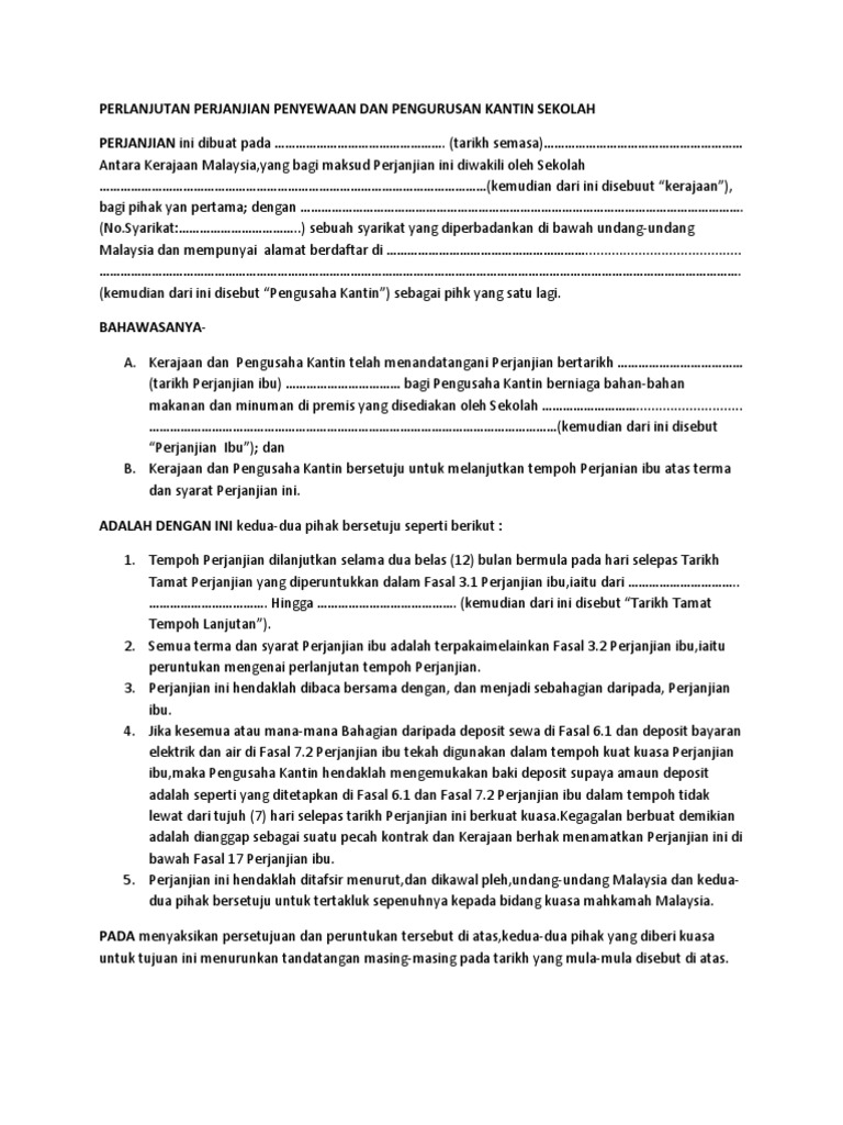 9 2 pengusaha kantin bertanggungjawab untuk membaiki apa apa kerosakan kepada perabot dan peralatan kantin atau membayar ganti rugi kepada sekolah bagi apa apa kerosakan yang tidak boleh dibaiki apabila diminta berbuat demikian dan sebelum tarikh tamat perjanjian. Pdf intipati tersirat dalam skop dan peranan guru penolong kanan kokurikulum pdf. Nama dan alamat berdaftar pengusaha kantin 19 2 perjanjian ini hendaklah ditafsirkan menurut dan dikawal oleh undang undang malaysia dan kedua dua pihak bersetuju untuk tertakluk sepenuhnya kepada bidang kuasa mahkamah malaysia.
