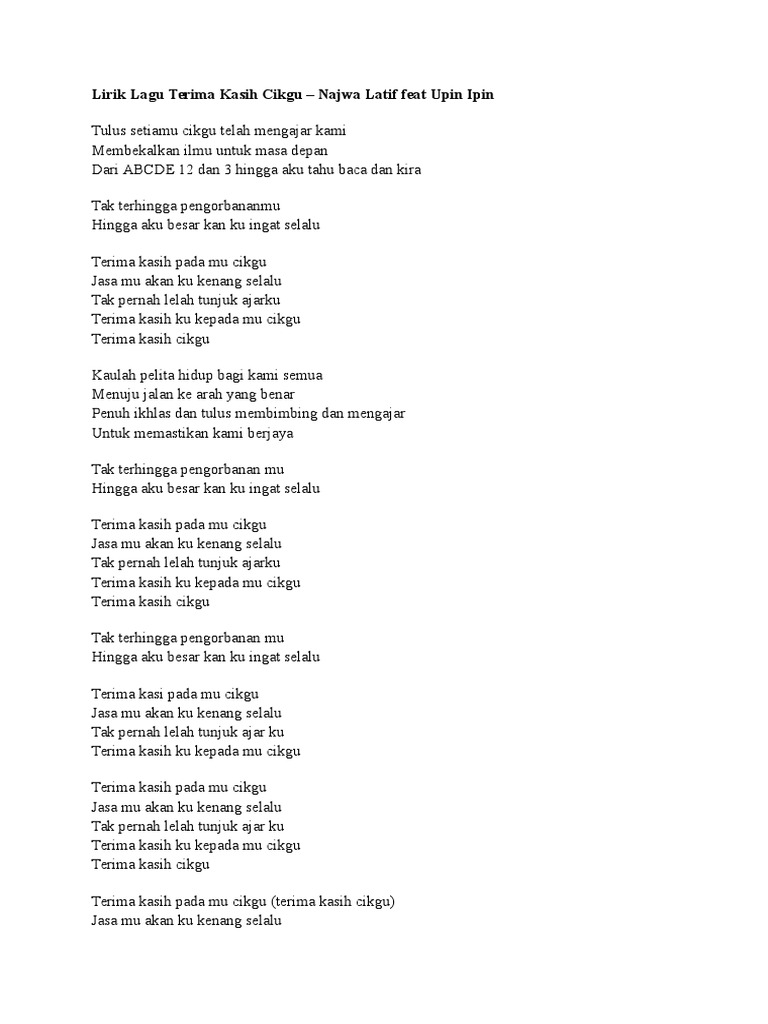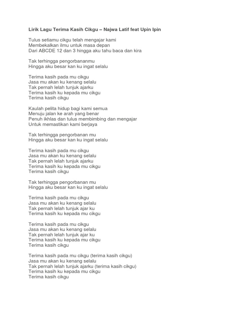 Lagu terima kasih cikgu najwa latif feat upin ipin ost upin dan ipin tulus setiamu cikgu telah mengajar kami membekalkan ilmu untuk masa depan. Lirik lagu didi friends lirik lagu didi friends tik tok lirik lagu didi friends wawa si lebah lirik lagu didi fr. Lirik lagu terima kasih cikgu najwa latif feat upin ipin tulus setiamu cikgu telah mengajar kami membekalkan ilmu untuk masa depan. Lirik lagu upin dan ipin terima kasih cikgu selamat pagi cikgu selamat pagu murid murid tulus setiamu cikgu telah mengajar kami membekalkan ilmu untuk masa depan.