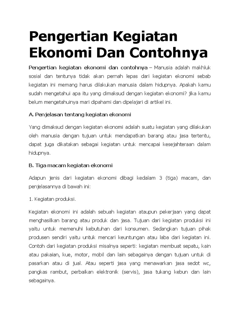 Menurut kamus dewan edisi keempat 2007 halaman 471 kegiatan ialah perihal atau keadaan giat kecergasan ataupun aktiviti. Calon pelajar peperiksaan tingkatan 3 kali tugasan geografi pt3 ini telah pun diminta untuk membuat persediaan yang rapi bagi menerang dan menjelaskan takrifan dan konsep kegiatan ekonomi secara umum yang mana merujuk kepada pekerjaan penduduk di kawasan kajiian yang anda lakukan. Produksi adalah aktivitas karyawan yang menciptakan produk atau pelayanan jasa yang mengumpulkan sumber daya modal dan keahlian tertentu. Menyatakan kegiatan ekonomi di kawasan kajian.