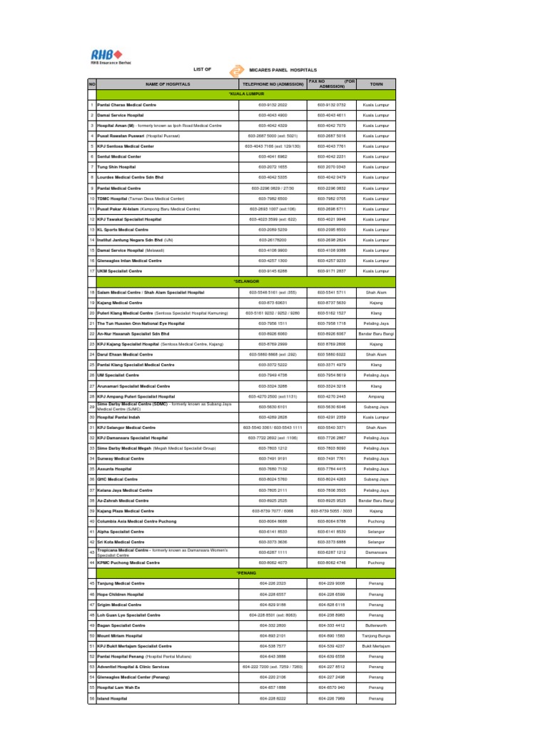 We micare is a third party administrator tpa that builds the connectivity applications and infrastructure for the exchange of transaction information linking up key players in the healthcare sector such as doctors patients government organizations corporates insurers to bring about a seamless and efficient management of healthcare services. State town clinic name address tel operating hours 1 kuala lumpur jalan sultan sulaiman klinik chin dataran kewangan darul takaful ground floor dataran kewangan darul takaful no. State town clinic name address tel operating hours 1 kuala lumpur jalan sultan sulaiman klinik chin dataran kewangan darul takaful ground floor dataran kewangan darul takaful no. Selangor 39 kpj selangor specialist hospital shah alam 603 5543 1111 40 kpmc puchong medical centre puchong 603 8062 4073 41 pantai hospital klang klang 603 3258 5412 42 putra medical centre sungai buloh sungai buloh 603 6156 4735.