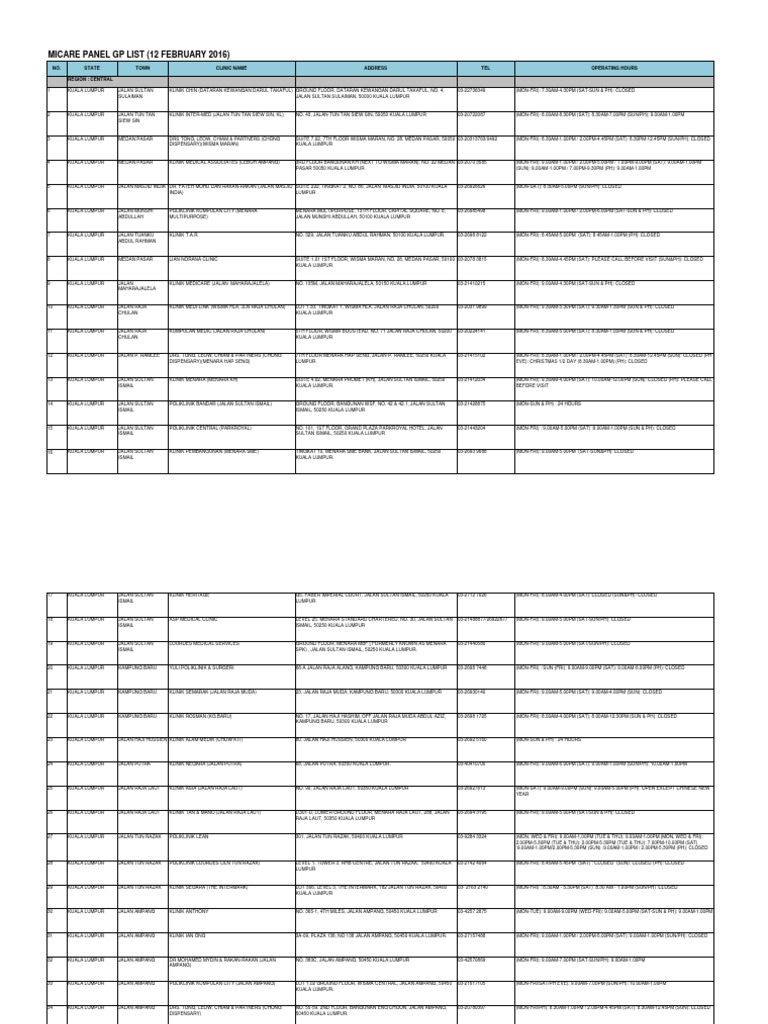 Micare panel clinic list 2018 malaysia. Klinik alam medic seksyen u3 53 jalan dinar g u3 g taman subang perdana. Central 18 kuala lumpur jalan p. Vg 30 jalan plumbum v7 v pusat komersial seksyen 7 40000 shah alam selangor darul. 4 jalan sultan sulaiman 50000 kuala lumpur.