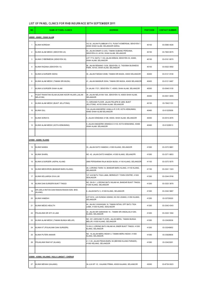State town clinic name address tel operating hours 1 kuala lumpur jalan sultan sulaiman klinik chin dataran kewangan darul takaful ground floor dataran kewangan darul takaful no. List of panel clinics for rhb insurance 30th september 2011. Pertubuhan keselamatan sosial pekerja perkeso compumed panel. 2 damai service hospital.