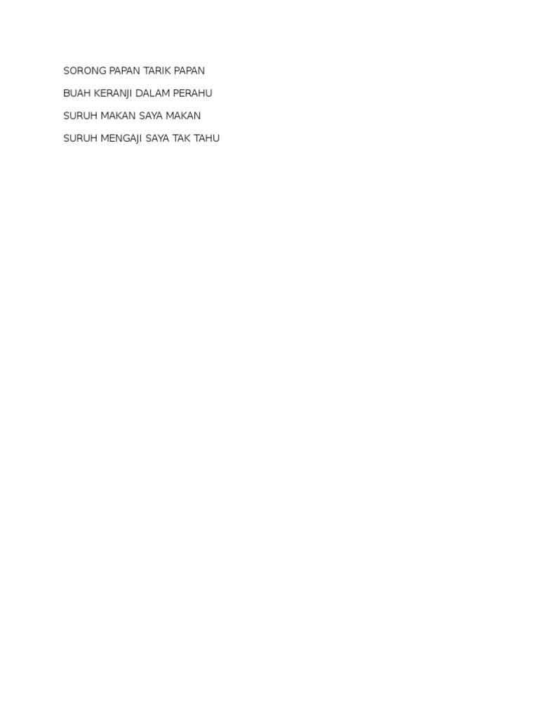 Pantun sorong papan tarik papan buah keranji dalam perahu. Sorong papan tarik padan. Sorong papan tarik papan. Suruh makan saya makan suruh mengaji saya tak tahu. Sorong papan tarik papan buah keranji dalam perahu suruh makan aku makan suruh mengaji aku tak tahu p s sebelum aku memulakan catatan.