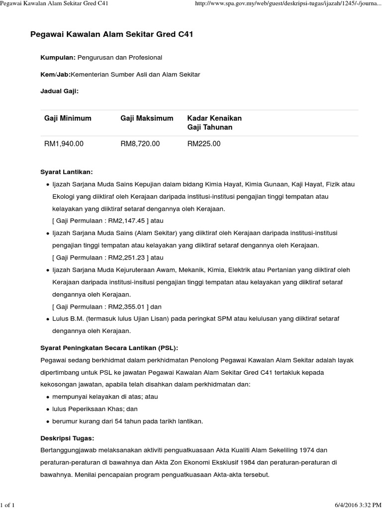 Fakta penting yang anda perlu tahu tentang calon calon temuduga kerja kerajaan. Gaji dan syarat lantikan. Tips temuduga kerja kerajaan. Berikut dikongsikan syarat lantikan dan kelayakan serta deskripsi tugas pegawai kawalan alam sekitar gred c41 termasuk jadual gaji minimum dan maksimum.
