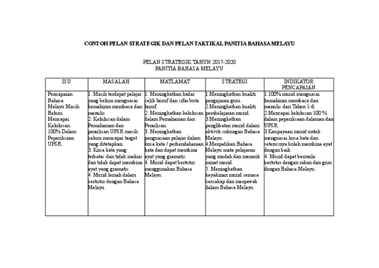 Pelan strategi tmk b. Pelan strategik panitia bahasa melayu kepada guru guru yang mengajar bahasa melayu terutamanya dikongsikan di sini contoh pelan strategik bagi panitia bahasa melayu di dalam ini juga terdapat pelan operasi dan pelan taktikal kepada guru yang berminat bolehlah dapatkannya di sini. S1 pengetua yang komited dan berpengalaman.
