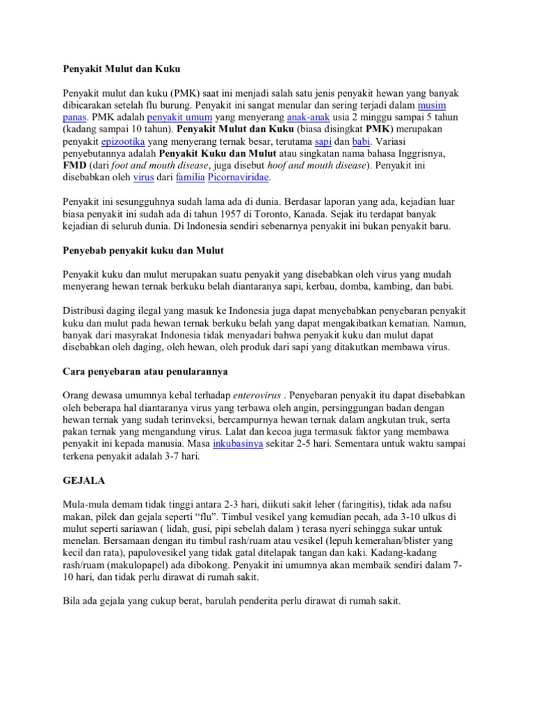 Penyakit mulut dan kuku penyakit mulut dan kuku adalah penyakit pada hewan yang disebabkan oleh infeksi virus aphthovirus dari famili picornaviridae. Penyakit mulut dan kuku atau fmd adalah penyakit yang sangat menular dan menyerang semua hewan berkuku genap. Demam yang tinggi kehilangan nafsu makan terlihat pelepuhan pada gusi dan selaput lendir salivasi tinggi banyak mengeluarkan air liur terdapat luka di antara kuku sehingga ternak sering terlihat pincang bahkan tidak dapat berjalan sama sekali. Melalui program vaksinasi secara teratur setiap tahun wabah dapat dikendalikan dan kasus pmk tidak muncul lagi.