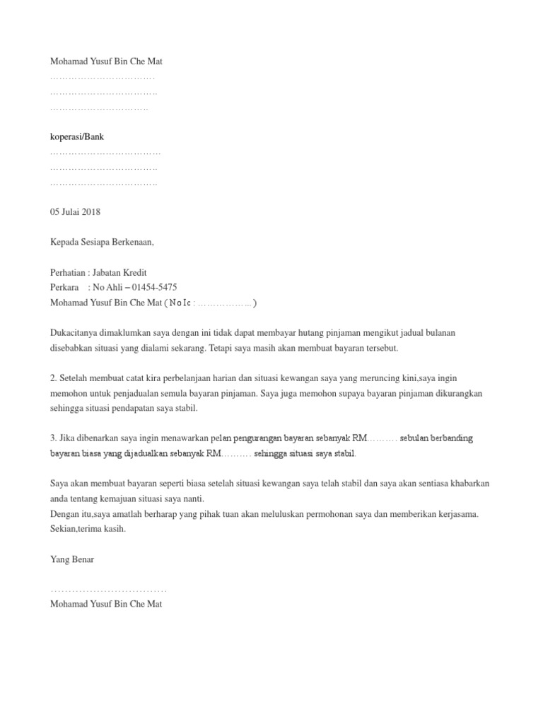 Permohonan contoh surat rayuan pengurangan bayaran pinjaman bank. Tetapi hendaklah dengan sebab yang munasabah dan bukannya sebab anda yang tak mahu bayar. Contoh surat permohonan keringanan pelunasan kredit bank. Sengaja tak bayar itu namanya tidak jujur. Surat rayuan pengurangan bayaran pinjaman surat rayuan pengurangan bayaran.