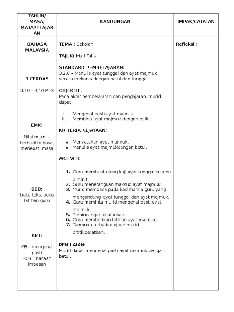 Ayat majmuk 2 soalan 4 ayat majmuk 2 soalan 2. Pengajaran bahasa melayu berbantukan komputer bmm 3105. Rph bahasa melayu tahun 2 adalah rancangan pengajaran harian yang perlu disediakan lebih awal oleh guru sebelum menjalankan sesi pegajaran dan pembelajaran rancangan pengajaran harian ini dibina sebagai panduan para guru untuk mengajar dengan lebih sistematik dan efektif serta mampu untuk mencapai apa yang diobjektifkan dalam sesi pengajaran dan pembelajaran kelak. 3 2 6 menulis ayat majmuk dengan betul dan kemas.
