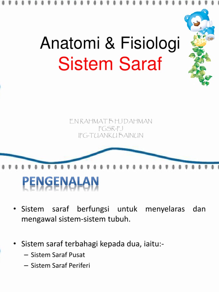 Mekanisme dan prinsip anda telah mengetahui bahwa rangsang yang diterima sel saraf dapat berasal dari dalam tubuh maupun luar tubuh rangsang yang merambat disebut impuls. Setiap impuls saraf akan berhubungan dengan sistem saraf yang terdiri dari sistem saraf sadar dan sistem saraf tak sadar atau sistem saraf otonom. Sistem saraf sadar terdiri atas 12 pasang saraf kranial yang keluar dari otak dan 31 pasang saraf spinal yang keluar dari sumsum tulang belakang 31 pasang saraf spinal terlihat pada gambar 8 8. Lapisan mielin sebelah luar disebut neurilemma yang melindungi akson dari kerusakan.