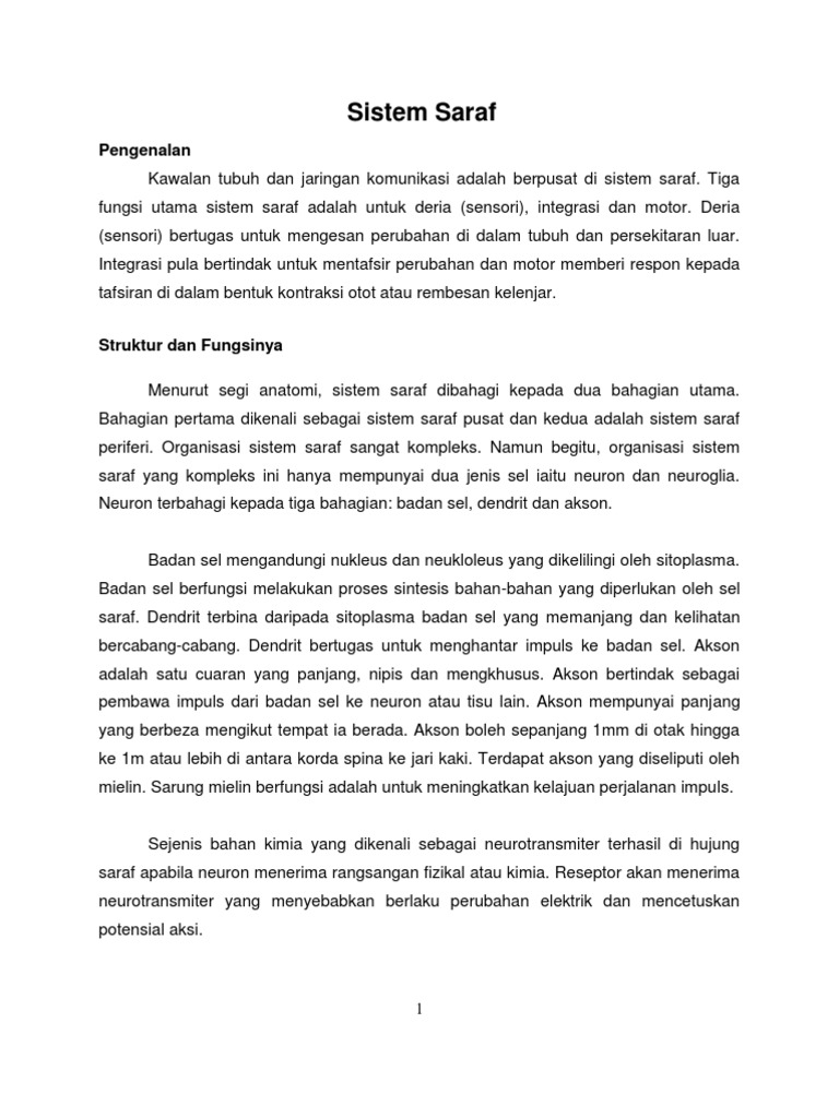 Saraf yang membawa impuls dari luar dikenali sebagai. Impuls diterima oleh reseptor kemudian akan dihantarkan oleh dendrit menuju badan sel saraf. Saraf ini mene ruskan impuls dari reseptor ke sistem saraf pusat dan meneruskan impuls dari sistem saraf pusat ke semua otot kerangka tubuh. Impuls adalah aktiviti elektrik yang sangat kecil terdapat pada membran neuron yang melaluinya maklumat akan dihantar sepanjang akson. Otak manusia mempunyai bahagian luar yang berwarna.