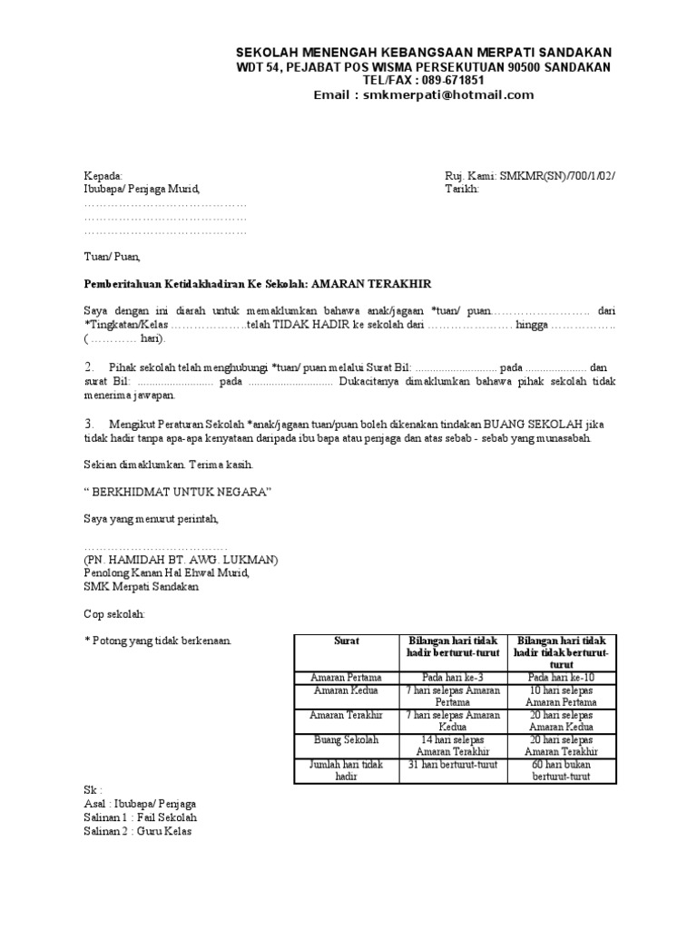 Unit disiplin smk bukit garam 90200 kinabatangan sabah. Sila hantar surat tersebut juga untuk pelajar yang telah ditandai p sebanyak 40 hari bukan secara berturut turut. Surat amaran atau peringatan biasanya diberikan kepada pekerja yang selalu lambat datang kerja walaupun dilabelkan sebagai amaran ianya berfungsi sebagai surat peringatan agar tidak mengulangi perbuatan yang sama.