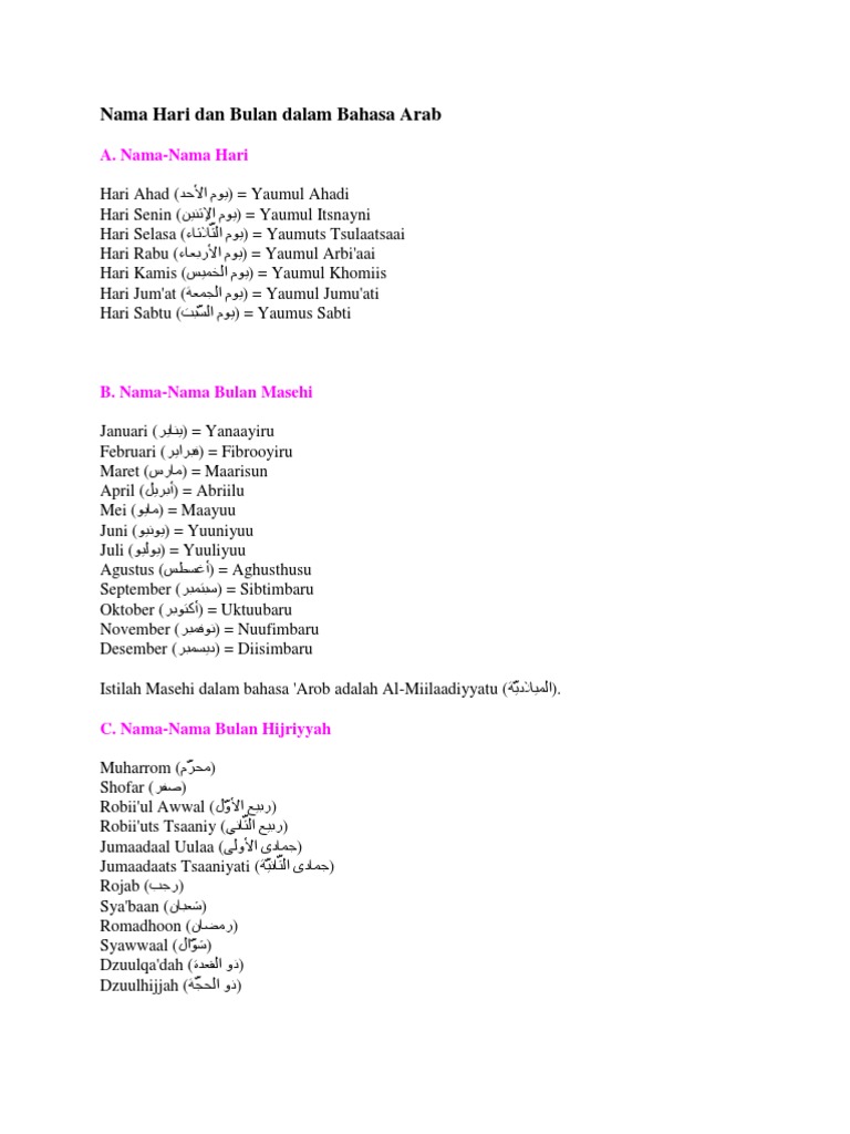 Adapun nama nama bulan hijriyah dan tulisannya dalam bahasa arab bisa anda temukan di postingan selanjutnya. Jumlah bulan hijriah sama halnya dengan bulan masehi bulan dalam penanggalan hijriyah juga berjumlah 12. Bahasa arab nama nama hari. Saya akan menuliskan urutan nama nama bulan baik dalam hijriyah qomariyah dan dalam masehi semuanya dalam bahasa arab beserta contoh kalimatnya dalam bahasa arab dan artinya dalam bahasa indonesia.