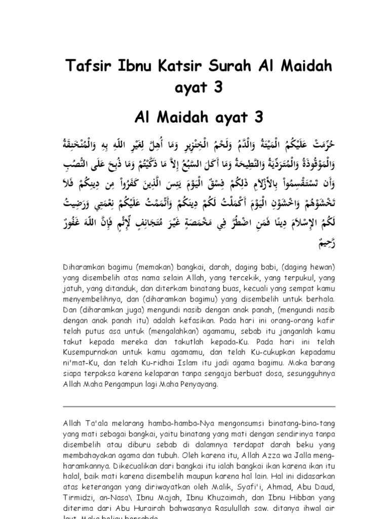 Baca ayat al quran tafsir hadits dan konten islami bahasa indonesia diharamkan bagimu memakan bangkai darah daging babi daging hewan yang disembelih atas nama selain allah yang tercekik yang terpukul yang jatuh yang ditanduk dan diterkam binatang buas kecuali yang sempat kamu menyembelihnya dan diharamkan bagimu yang disembelih untuk berhala. Surat al maidah ayat 3 ini ialah merupakan ayat tekahir yang di tunkan kepada nabi muhammad. Urutan surat ke lima dalam al qur an ini masuk surat madaniyah atau surat yang di turunkan di kota mekah yan terdiri dari 120 ayat. Pada ayat yang lalu telah dijelaskan beberapa perbuatan yang diharamkan.
